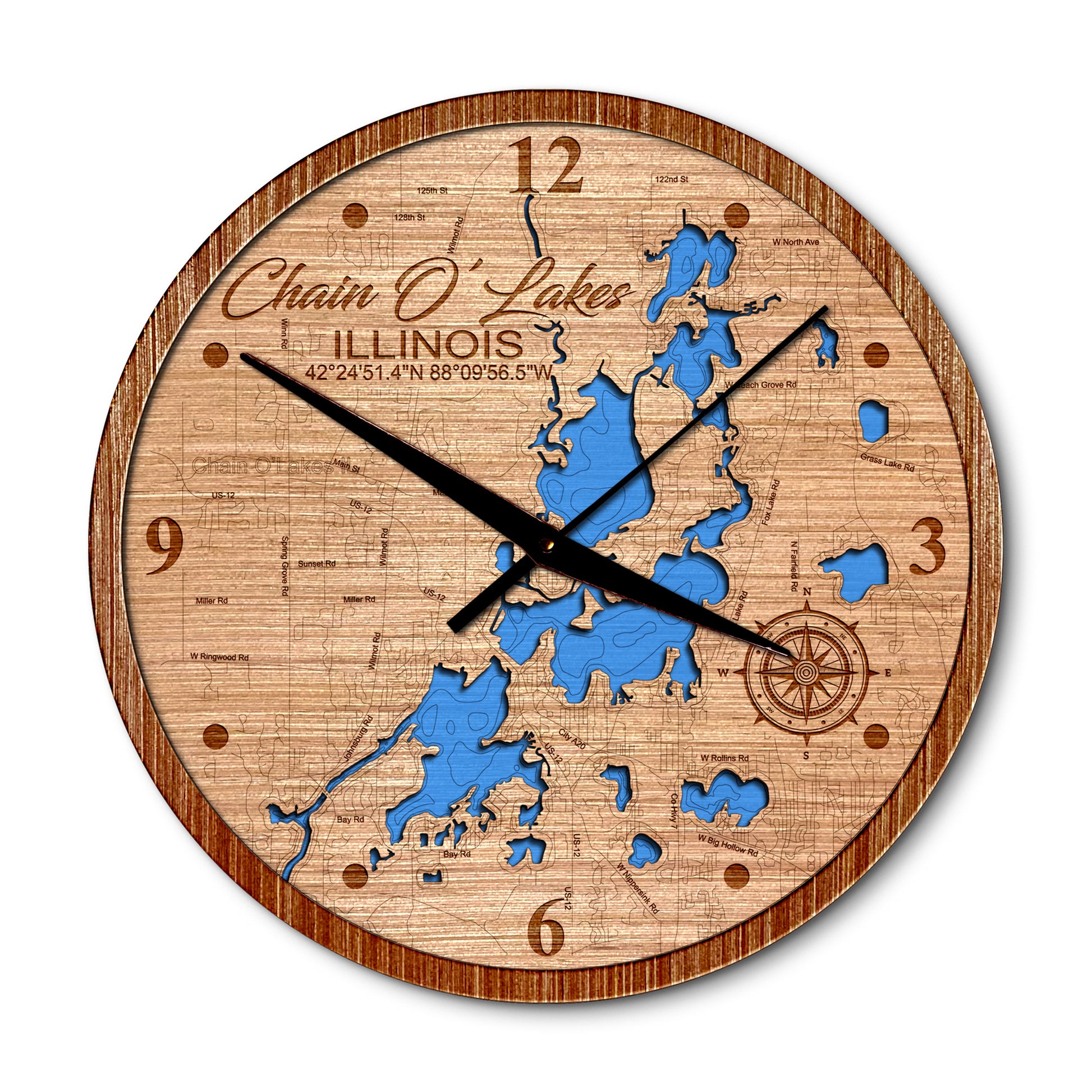 Chain O' Lakes, Illinois Layered Map Clock - Any Lake, Pond, or Reservoir - Unique Home Decor